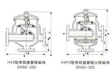 HXF2带双接管呼吸阀根据国家标准《石油化工企业设计防火规范》(GB50160-92)之规定:甲、乙类液体的固定顶罐,应设阻火器和呼吸阀。可见呼吸阀、阻火器是储罐不可缺少的安全设施。它不仅能维持储罐气压平衡,确保储罐在超压或真空时免遭破坏,且能减少罐内介质的挥发和损耗。上海南昌德华社会服务咨询有限公司厂生产的呼吸阀,具有结构紧凑、通气量大、泄漏量小、密封性能好等特点。
